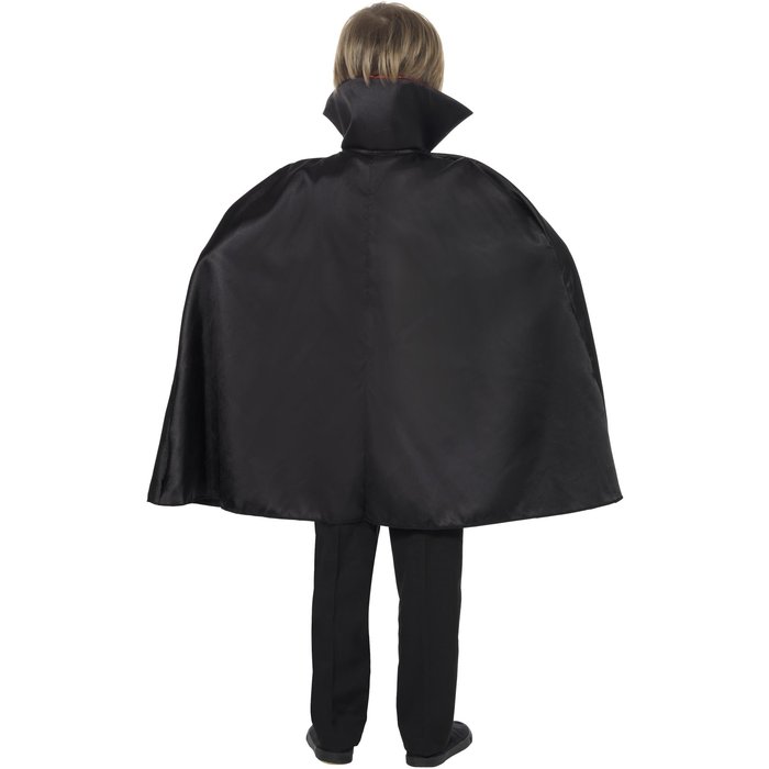 Das 4-teilige Set besteht aus einem Umhang mit rotem Kragen, einer Weste mit Glanzstoff, einer Kummerbund-Schärpe und einer Krawatte mit Kreuz-Anhänger. Bequem zu tragen und schnell angezogen – ideal für alle jungen Blutsauger, die an Halloween richtig glänzen wollen.