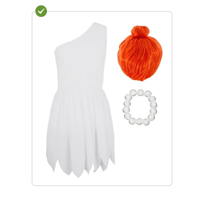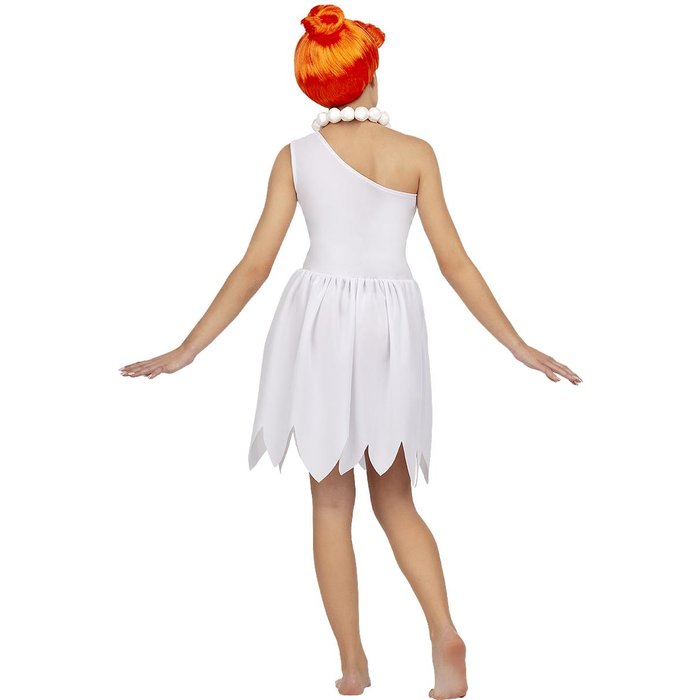 Das weisse Kleid mit gezacktem Saum greift Wilmas typischen Stil auf und sitzt angenehm leicht, sodass du dich problemlos bewegen kannst. Die orangefarbene Perücke mit dem charakteristischen Dutt sorgt für den sofortigen Wiedererkennungswert, während die grosse Perlenkette das Outfit authentisch abrundet.
