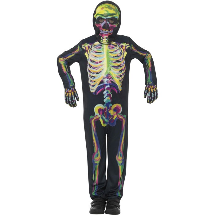 Dieses Glow in the Dark Skelett Kostüm bringt Farbe und Grusel perfekt zusammen! Der schwarze Overall mit buntem Skelettmuster leuchtet im Dunkeln und sorgt damit für einen richtig coolen Auftritt an Halloween. Wenn das Licht ausgeht, beginnt dein Skelett zu strahlen – perfekt für Nachtpartys, Umzüge oder Trick-or-Treat.