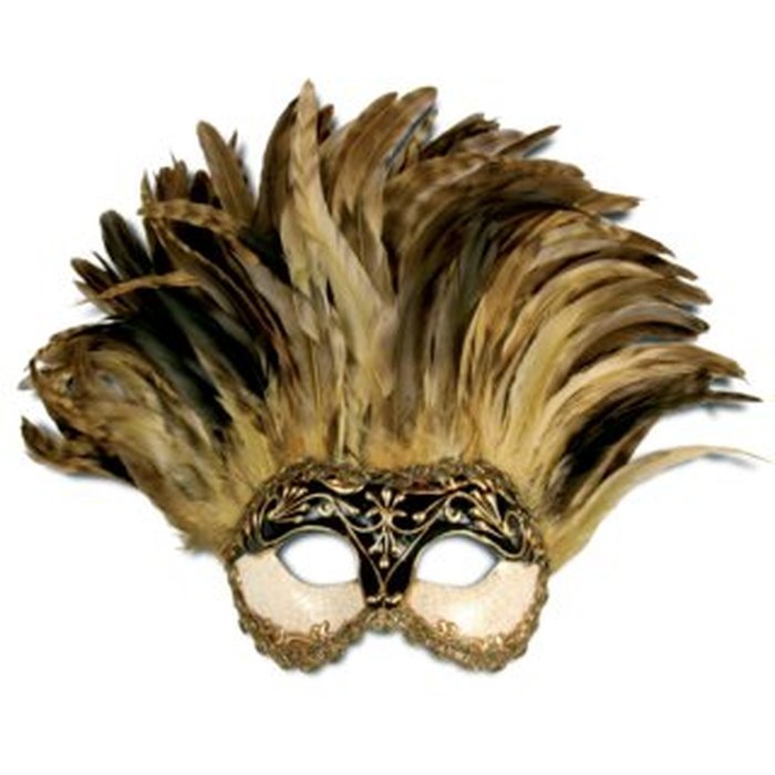 Lieferumfang: 1 kunstvolle Maske mit Federn und schwarzem Halteband zum Knüpfen, in den Farben gold, weiss und schwarz