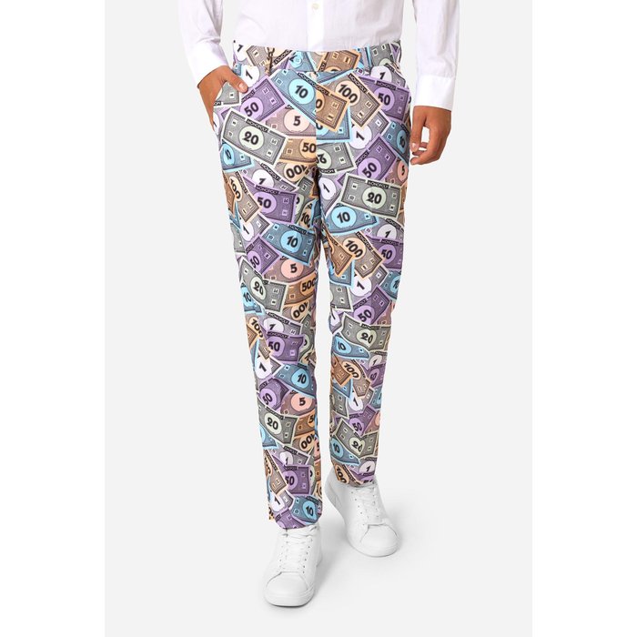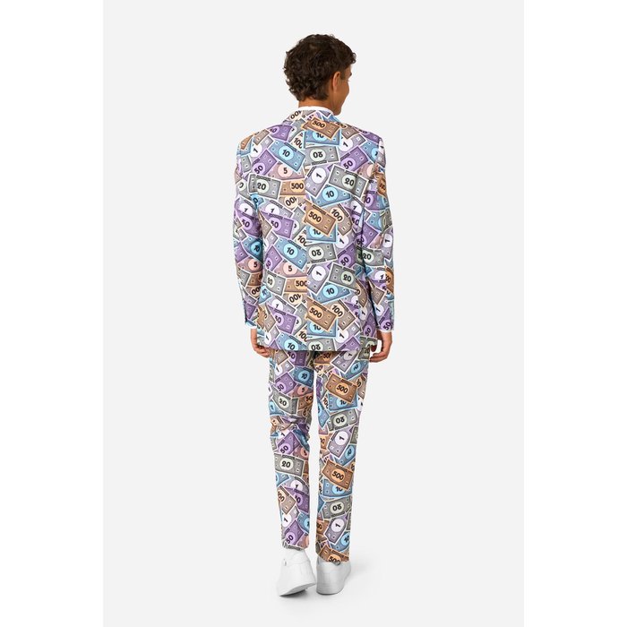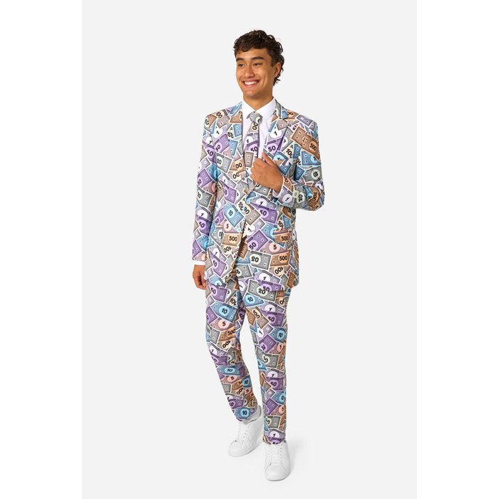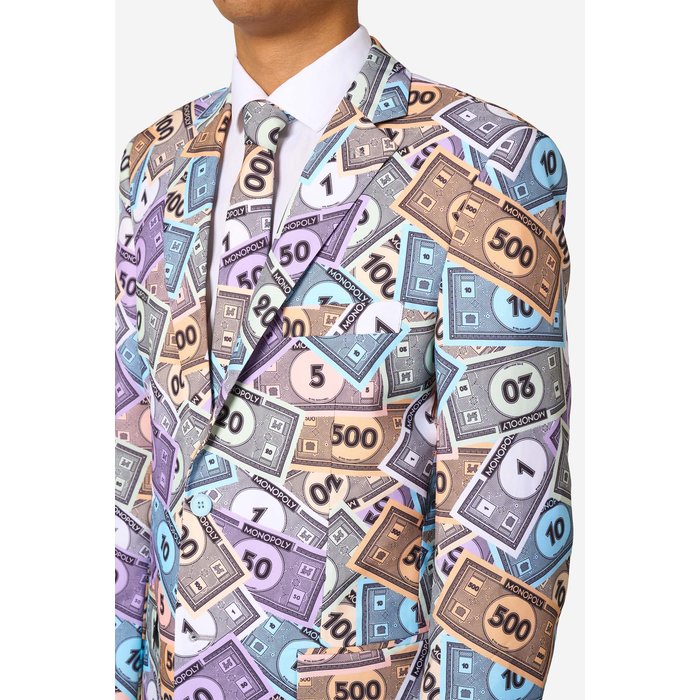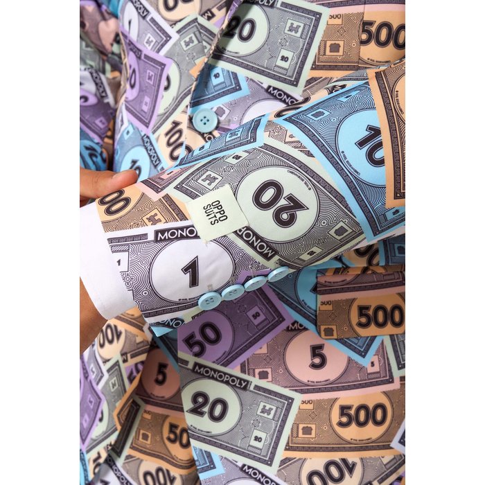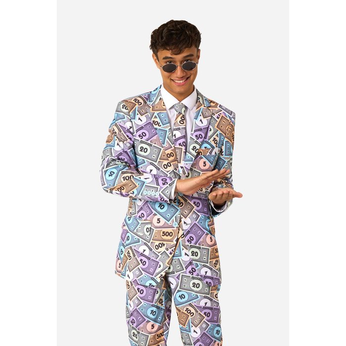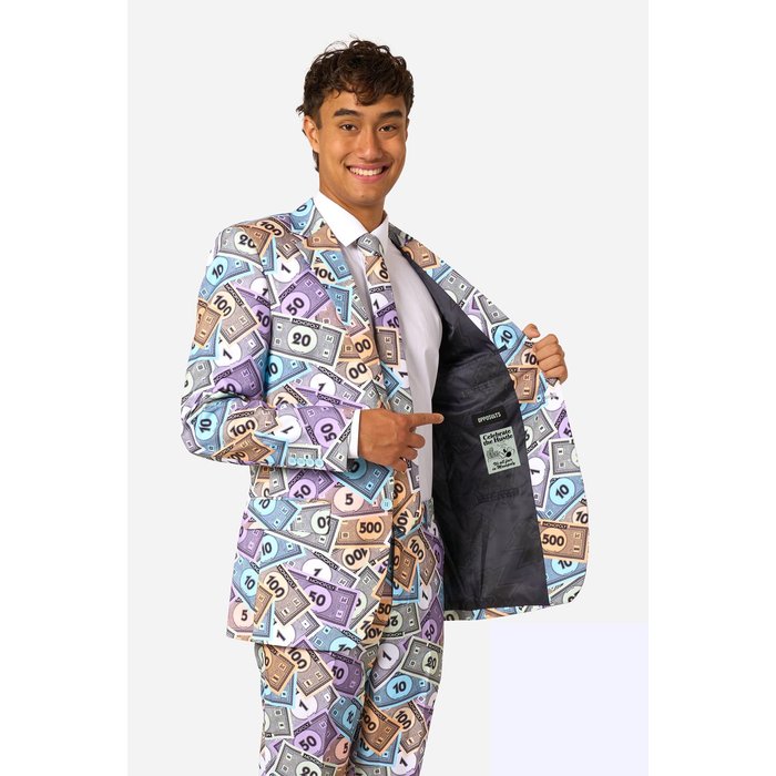 Mit diesem offiziell lizenzierten Monopoly Geld Anzug ziehst du garantiert alle Blicke auf dich. Das einzigartige Allover-Design mit bunten Spielgeld-Scheinen sorgt für einen humorvollen und gleichzeitig stylischen Look. Perfekt für alle, die an einer Mottoparty auffallen und dabei richtig Eindruck machen wollen.