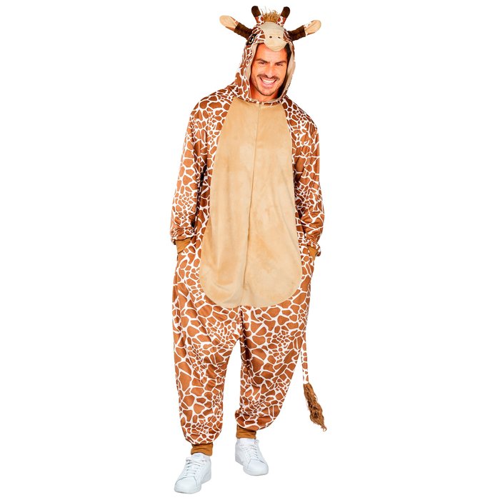 Die Kapuze mit Giraffenkopf, Ohren und kleinen Hörnern sorgt für den typischen Look, während der Schwanz auf der Rückseite das Kostüm perfekt ergänzt.