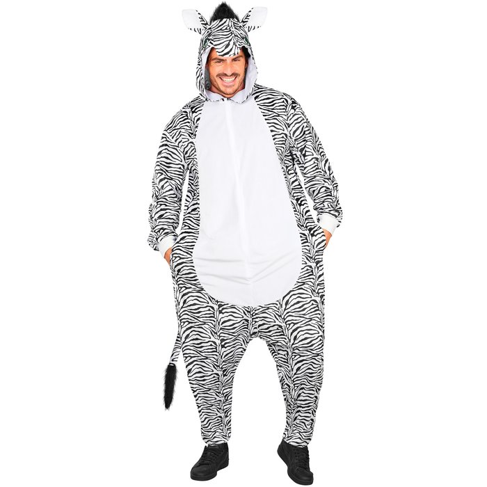 Die Kapuze mit Zebra Gesicht, Ohren und Mähne sorgt für den typischen Look, während der Schwanz auf der Rückseite das Kostüm perfekt abrundet.