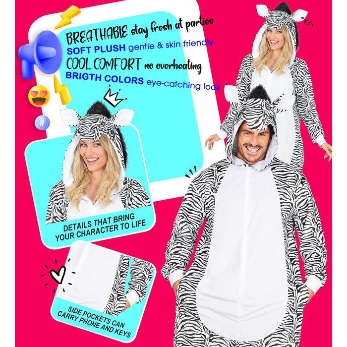 Wild, bequem und perfekt für deinen nächsten Auftritt. Dieses Zebra Onesie Plüschkostüm kombiniert auffälliges Design mit maximalem Tragekomfort.