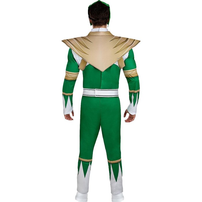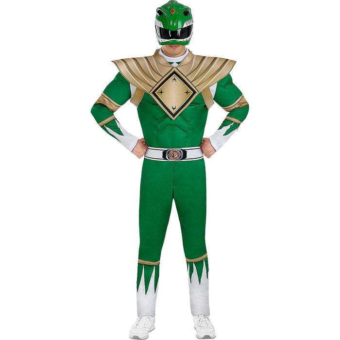 Mit dem grünen Power Ranger Kostüm für Erwachsene bist du sofort bereit für Action. Der enganliegende Overall mit integrierter Muskel-Polsterung sorgt für eine kraftvolle Optik, während das goldene Bruststück den ikonischen Look der Serie perfekt widerspiegelt. Ein Reissverschluss an der Hose erleichtert das Anziehen.