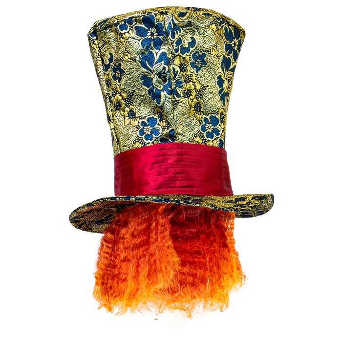 Der Hut erinnert sofort an eine märchenhafte Teeparty voller Chaos und Kreativität. Das detailreiche Design mit farbigem Stoff, rotem Hutband und integrierten Haaren sorgt für einen starken Wiedererkennungswert und macht dein Outfit im Handumdrehen komplett.