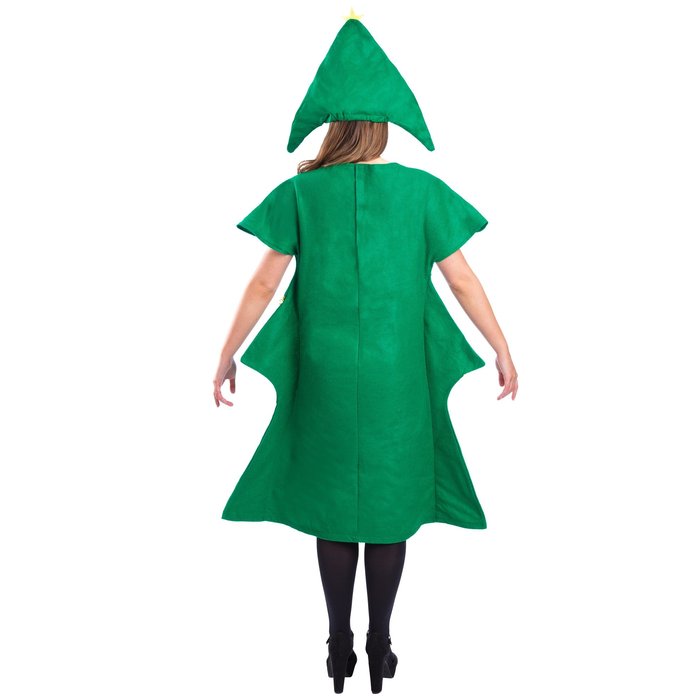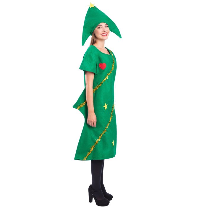 Die grüne Tunika ist in einer markanten Tannenbaum-Form gestaltet und mit goldener Girlande, Sternen und kleinen Deko-Elementen versehen, wodurch sofort ein festlicher Look entsteht. Die passende spitze Mütze mit Stern rundet das Kostüm perfekt ab und macht dich zum humorvollen Highlight jeder Party.
