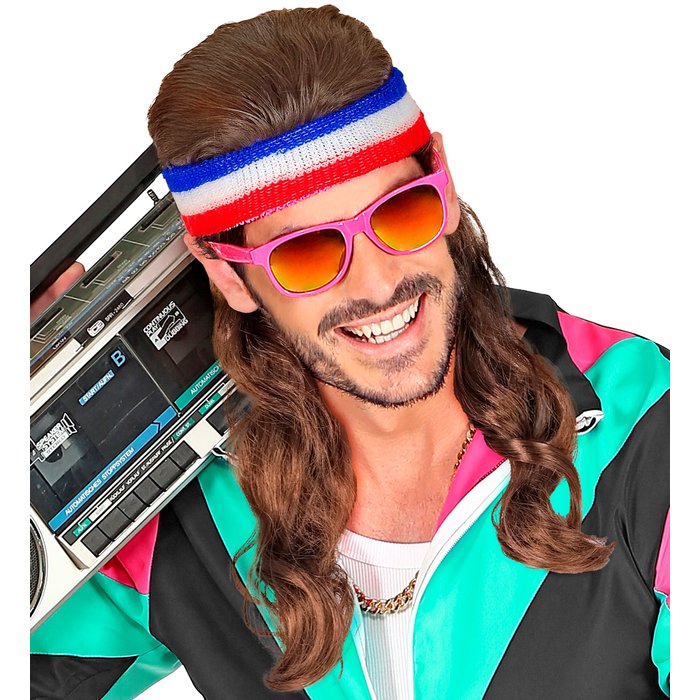 Avec ce bandeau à cheveux qui ne passe pas inaperçu, tu remets au goût du jour le look tennis légendaire des années 80. Ce bandeau sportif bleu, blanc et rouge, associé à des cheveux bouclés et volumineux, te donne immédiatement un vrai look rétro pour toutes les fêtes.