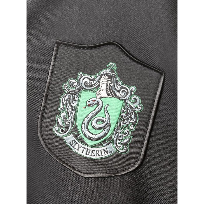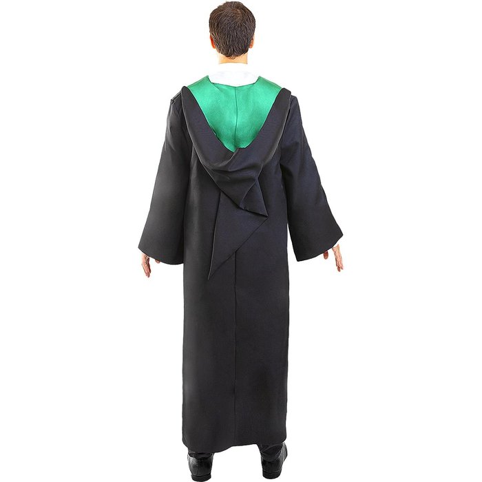 La longue cape noire descend jusqu'aux pieds et est doublée d'un vert intense à l'intérieur. Sur la poitrine se trouve l'emblématique blason Serpentard, symbole évident de détermination, de domination et de volonté sans compromis. La capuche souligne l'aspect mystérieux, tandis que les manches larges et la fermeture à l'avant assurent un confort agréable. Un look pour les sorciers et sorcières qui préfèrent planifier dans l'ombre plutôt que briller sous les projecteurs.