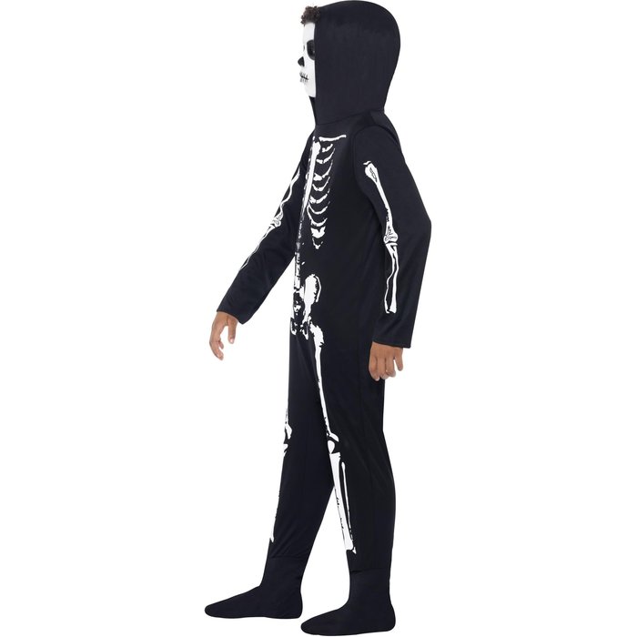 Avec ce costume classique de squelette, tu seras le squelette le plus cool de la nuit d'Halloween ! Cette combinaison noire avec des os blancs imprimés et une capuche cousue te donne un look effrayant parfait : simple, confortable et toujours accrocheur.