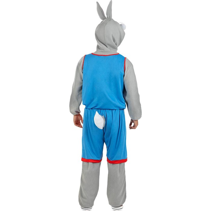 Das Kostüm besteht aus einem grauen Plüsch-Overall mit Reissverschluss, Kapuze mit langen Ohren und gesticktem Bugs-Bunny-Gesicht. Der weisse Bauchbereich und der gepolsterte Schwanz sorgen für den typischen Look.