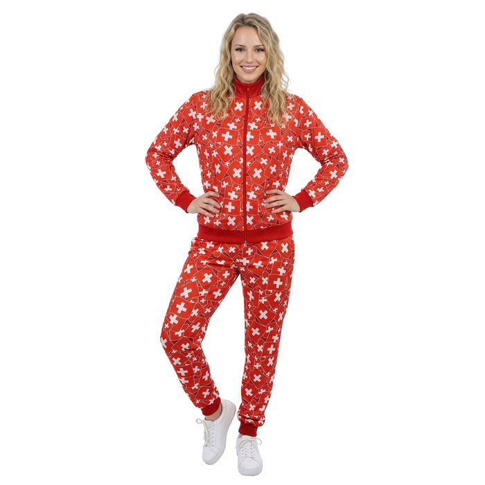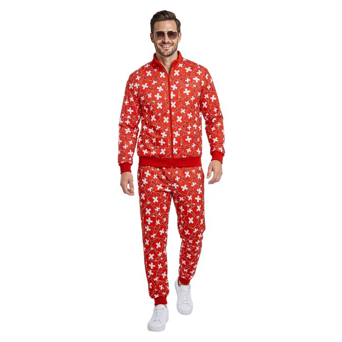 Avec ce survêtement suisse style années 80, tu es prêt à faire une entrée remarquée en tant que fan. L'ensemble veste et pantalon, dans un rouge et blanc éclatant orné de croix suisses, te donne immédiatement un look rétro authentique et attire tous les regards.