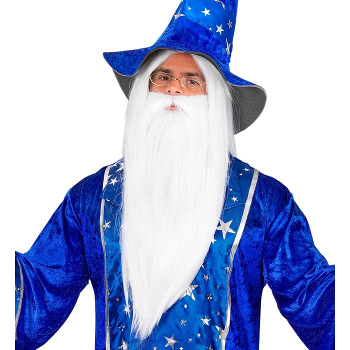 Avec cette perruque de sorcier avec une barbe et une moustache extra longues, tu te transformes en un clin d'œil en un vieux magicien vénérable.