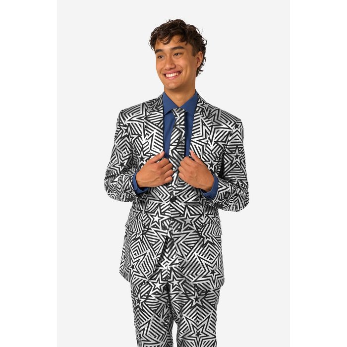 Ogni set comprende giacca, pantaloni e cravatta abbinata. Indossalo e diventa il re della festa!