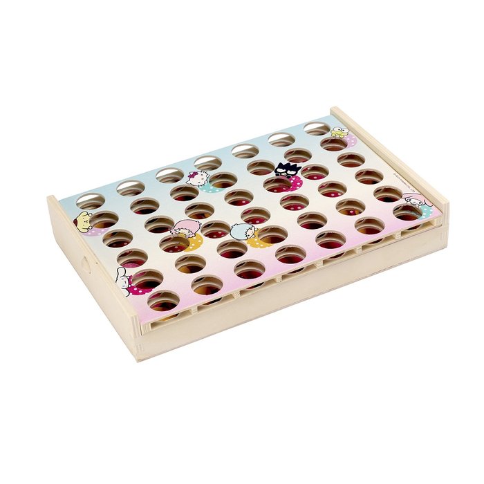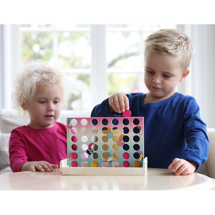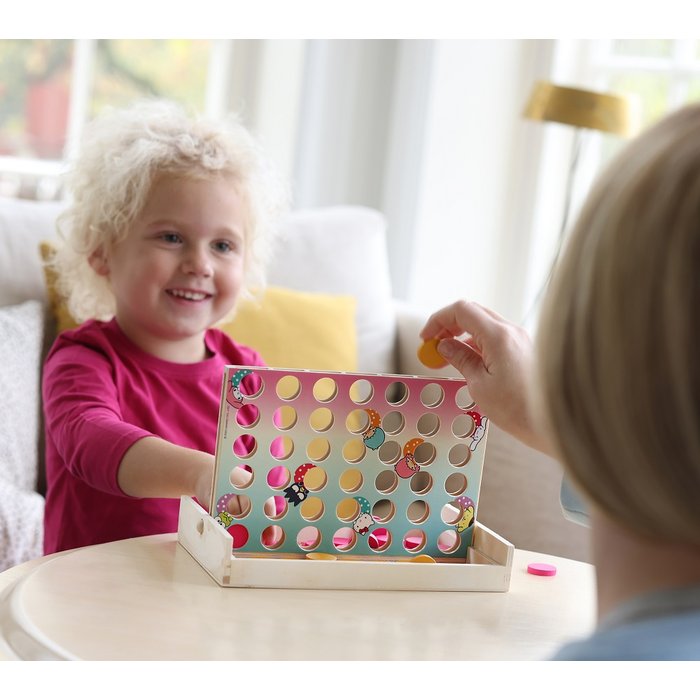 Il gioco per bambini è in legno e include 1 tabellone, 21 dischi rosa, 21 dischi gialli, un contenitore per riporre i dischi e le istruzioni di gioco.