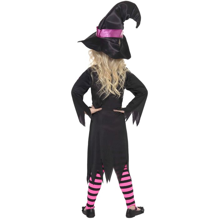 Con questo carinissimo costume da strega, la tua bambina diventerà una piccola maga! L'abito nero è decorato con stelle colorate e una graziosa applicazione a forma di gatto.