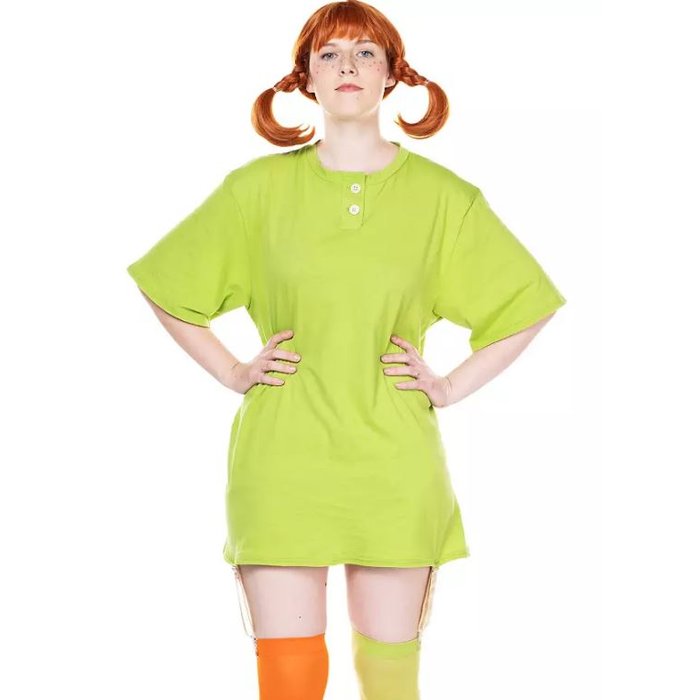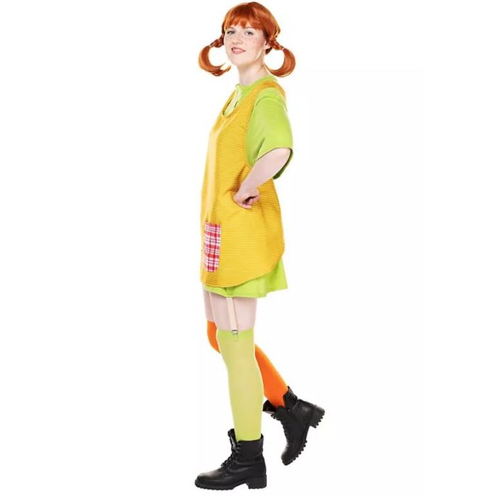 Il set di 4 pezzi include una camicia con reggicalze cuciti, un grembiule abbinato e un paio di calze di colori diversi. Così avrai subito il tipico stile di Pippi con una gamba verde e una arancione.