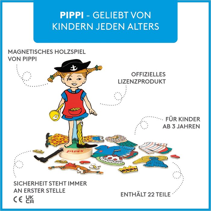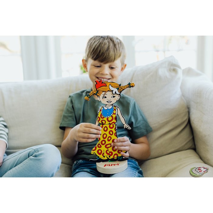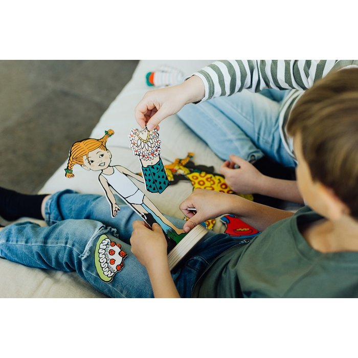 Questa bambola di Pippi in legno ha 20 magneti a forma di vestiti e accessori divertenti, così puoi vestire Pippi come una classica bambola da ritagliare.