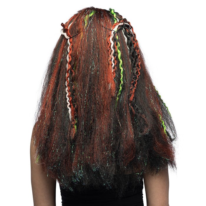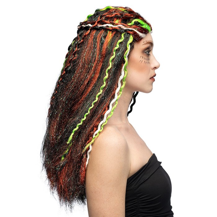 Mistica, selvaggia e piena di energia. Questa parrucca voodoo con lunghi dreadlocks ti dà subito un look potente e misterioso. La combinazione di colori scuri con accenti vivaci in verde neon, bianco e rame dà all'acconciatura un'aura speciale e spirituale.