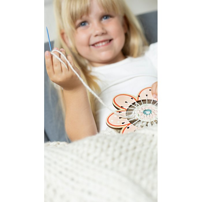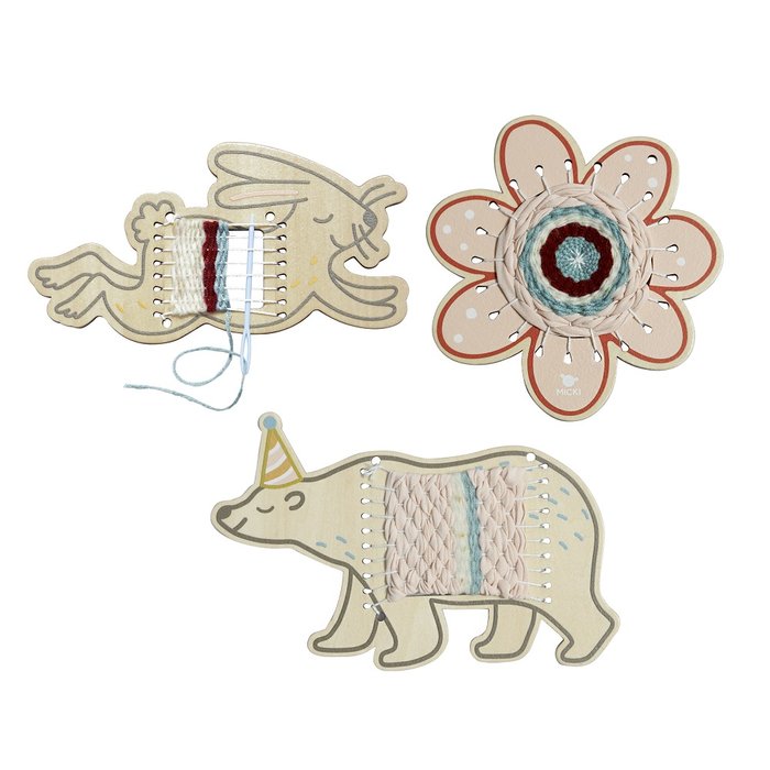 Contenuto 3 piccoli telai a forma di orso, coniglio e fiore. Il set per tessere include anche un ago smussato, fili di ordito e 4 filati di diverse strutture e colori.